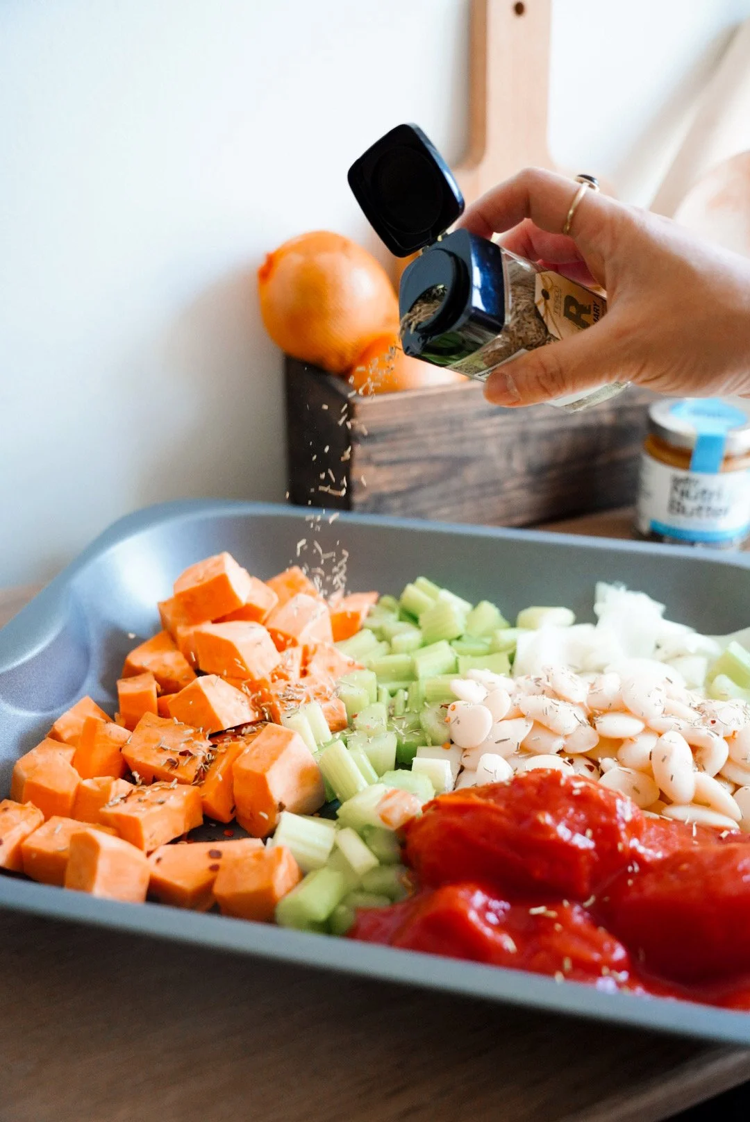 Whilst boiling put all other ingredients into a large saucepan and mix. Season well.